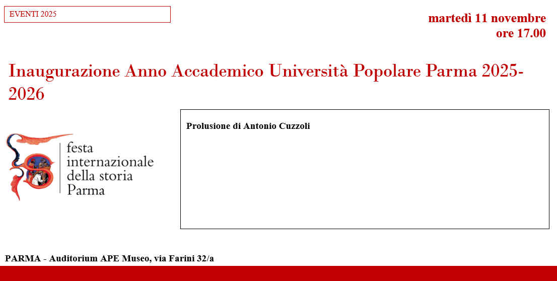 Inaugurazione Anno Accademico Università Popolare Parma 2025-2026 – Giacomo Casanova (1725-1798) Prolusione di Antonio Cuzzoli martedì 11 novembreore 17 PARMAAuditorium…