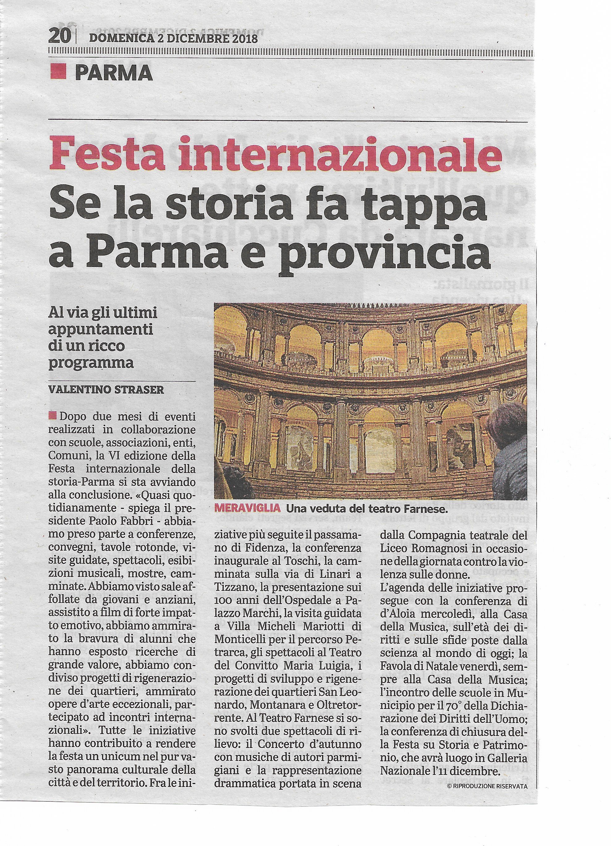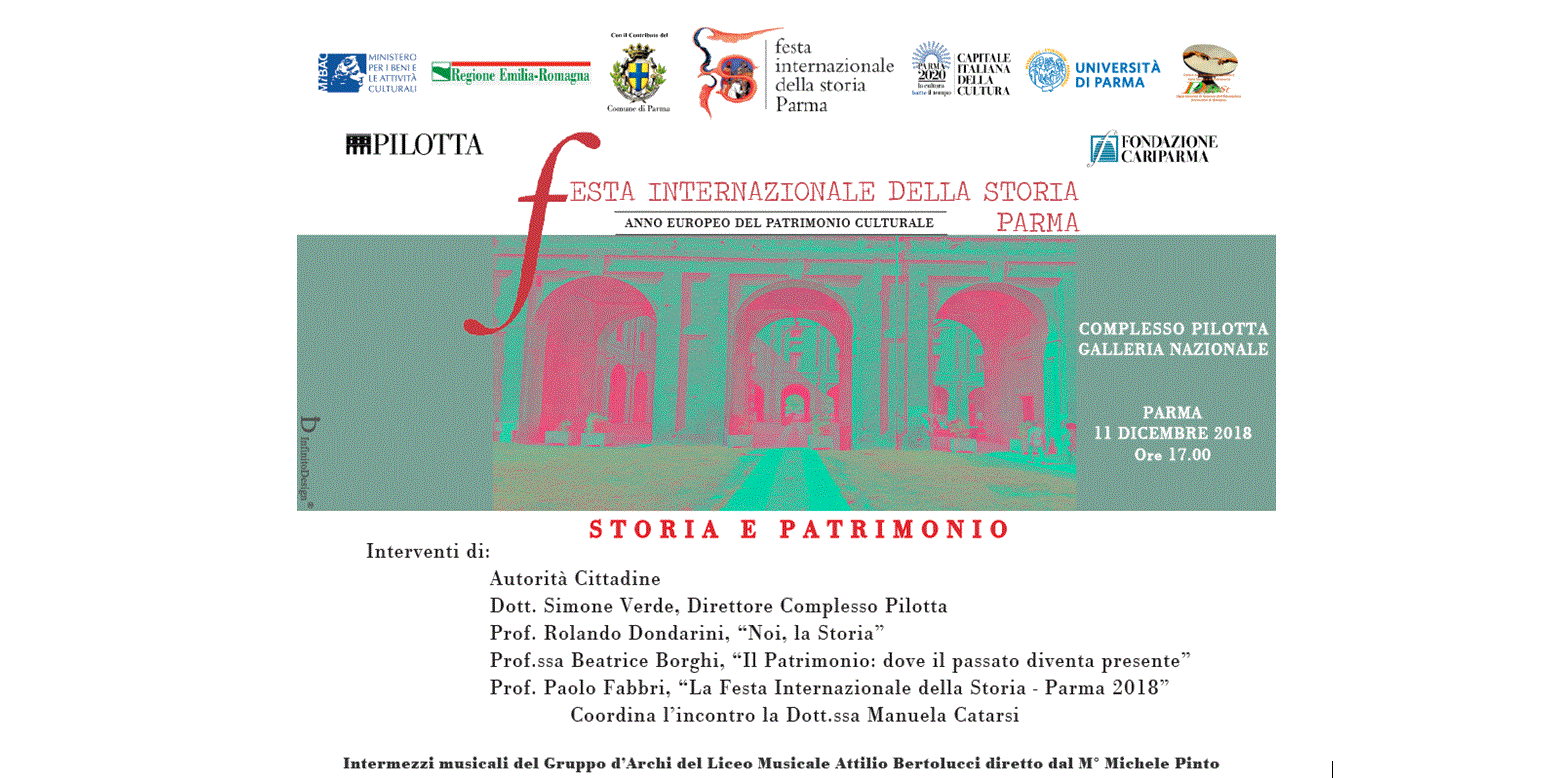 Parma, Complesso Pilotta, Galleria Nazionale STORIA E PATRIMONIO Conclusione Festa 2018 con intermezzo musicale a cura del Gruppo d’Archi del Liceo Musicale Bertolucci, diretto da Michele Pinto Interventi di Simone Verde, Rolando Dondarini, Beatrice Borghi, Paolo Fabbri. Coordina l’incontro Manuela