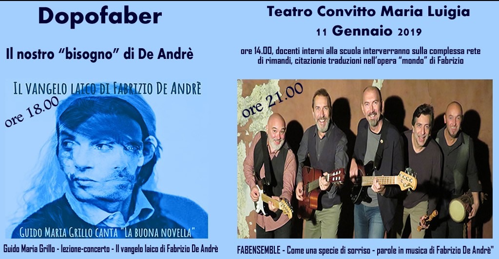 L’undici gennaio 2019 presso il Convitto Nazionale Maria Luigia di Parma si terrà una giornata di studi in musica e parole destinata alla celebrazione di Fabrizio de Andrè in occasione dei vent’anni dalla morte. Affronteremo l’avventura musicale pionieristica e coraggiosa di Fabrizio, così attuale e così necessaria, cercando di capire in che cosa risieda, oggi, il nostro “bisogno” di De Andrè.