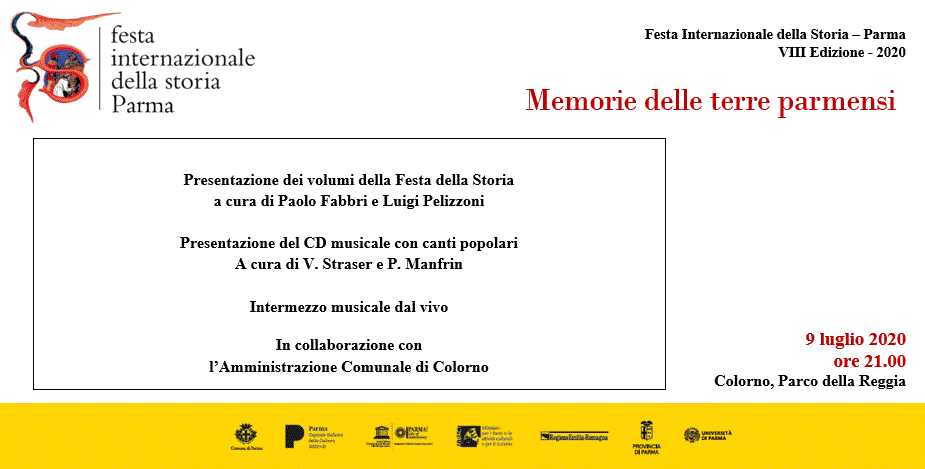 “Memorie delle terre parmensi” 9 luglio 2020 ore 21.00 – 23.00 a Colorno, Parco della Reggia Presentazione dei volumi della Festa della Storia a cura di Paolo Fabbri e Luigi Pelizzoni e presentazione del CD musicale con canti popolari a