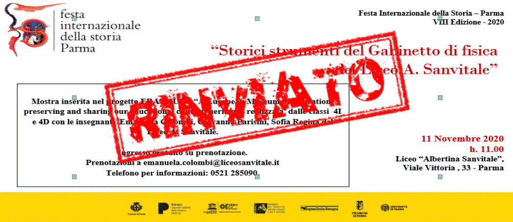 11 Novembre 2020 h. 11 inaugurazione (apertura 12- 20 novembre) presso il Liceo “Albertina Sanvitale” sede di Viale Vittoria , 33 – Parma Mostra inserita nel progetto ERASMUS + “A European Museum of Education: preserving and sharing our educational cultural