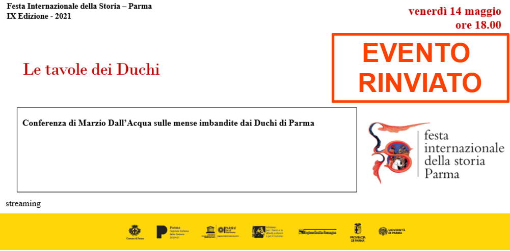 EVENTO RINVIATO PER MOTIVI TECNICI Venerdì 14 maggio ore 18.00 streaming: https://zoom.us/j/98691936389 Conferenza di Marzio Dall’Acqua sulle mense imbandite dai Duchi di Parma LOCANDINA