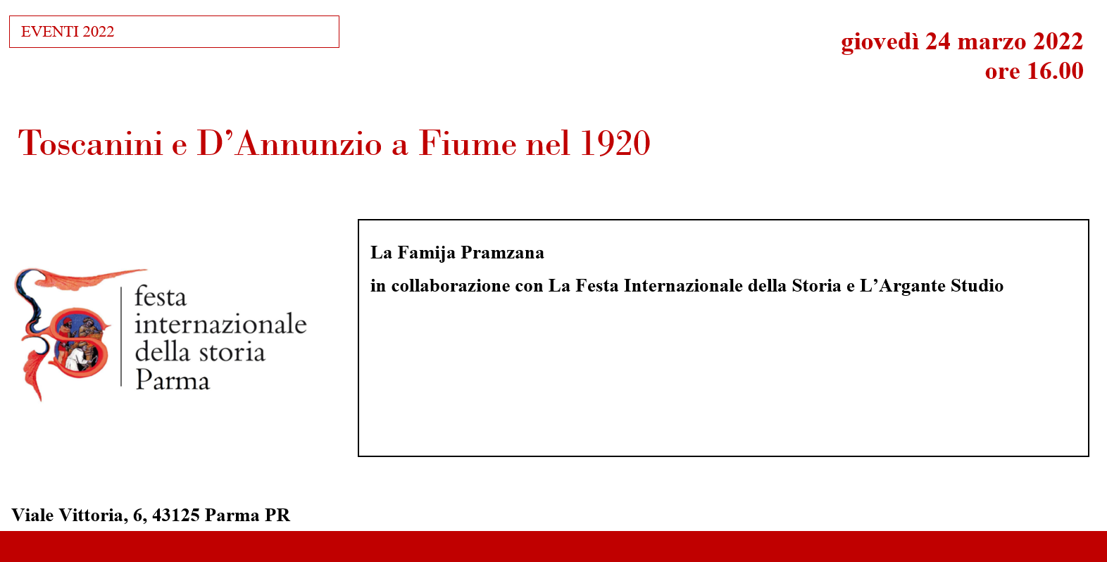 giovedì 24 marzo 2022, ore 16.00, Porta San Francesco, Sala Barilla La Famija Pramzana in collaborazione con La Festa Internazionale della Storia e L’Argante Studio presenta Toscanini e D’Annunzio a Fiume nel 1920. Ideato e introdotto da Ubaldo Delsante Elaborazione