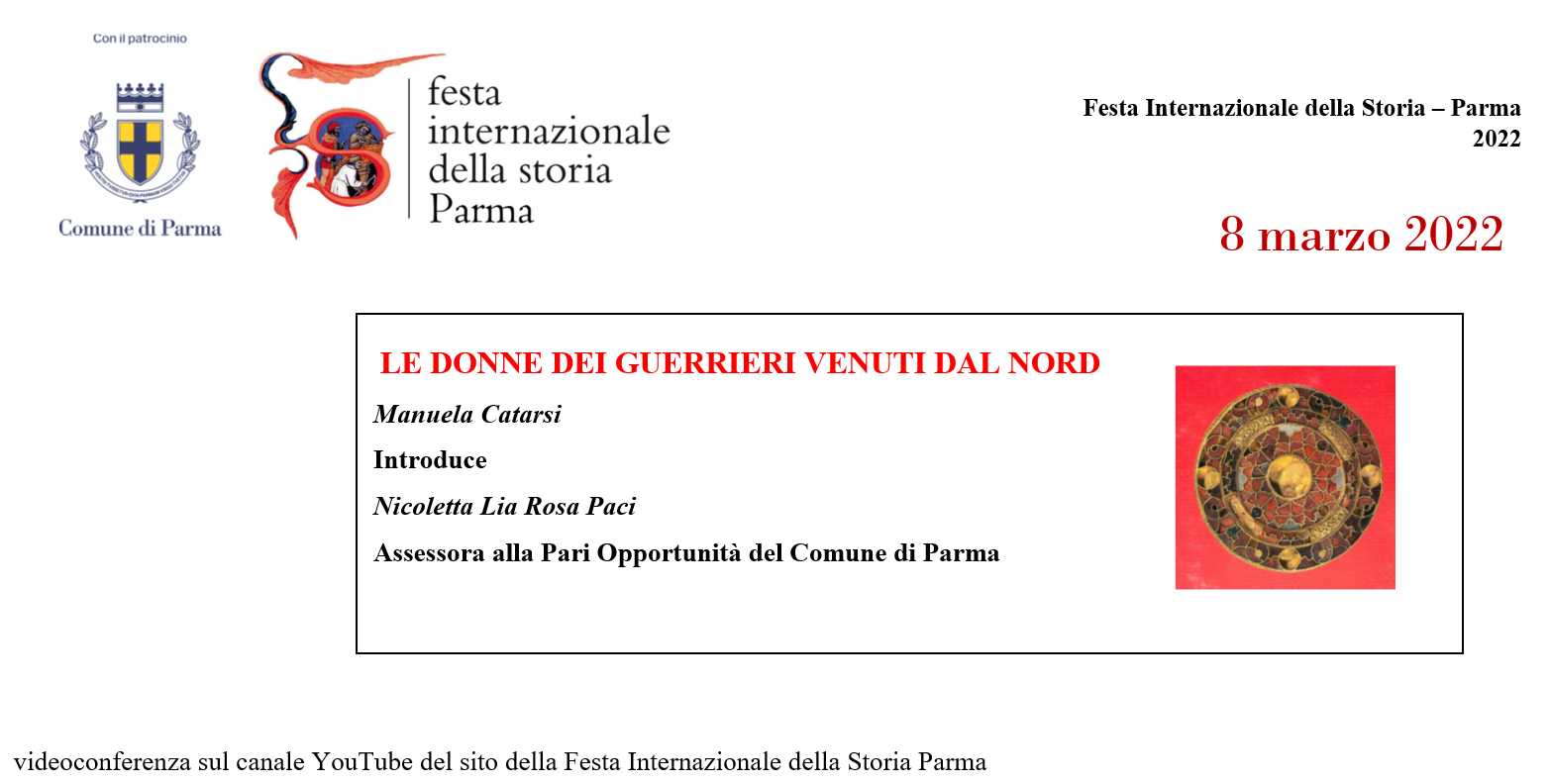 LOCANDINA Le donne dei guerrieri venuti dal NordManuela Catarsi Introduce Nicoletta Lia Rosa PaciAssessora alle Pari Opportunità del Comune di Parma 8 marzo 2022videoconferenza sul canale YouTube del sito della Festa della Storia di Parma