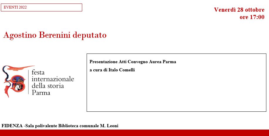 LOCANDINA Agostino Berenini deputato Presentazione Atti Convegno Aurea Parma a cura di Italo Comelli Venerdì 28 ottobre ore 17:00 FIDENZA -Sala polivalente Biblioteca comunale M. Leoni