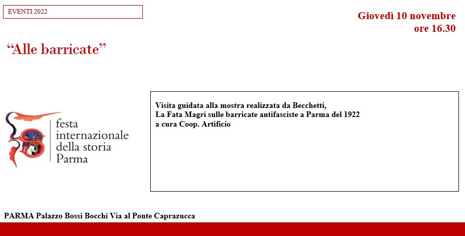 LOCANDINA “Alle barricate” Visita guidata alla mostra realizzata da Becchetti, La Fata Magri sulle barricate antifasciste a Parma del 1922 a cura Coop. Artificio Giovedì 10 novembre h. 16,30 PARMA Palazzo Bossi Bocchi Via al Ponte Caprazucca Prenotazione obbligatoria a