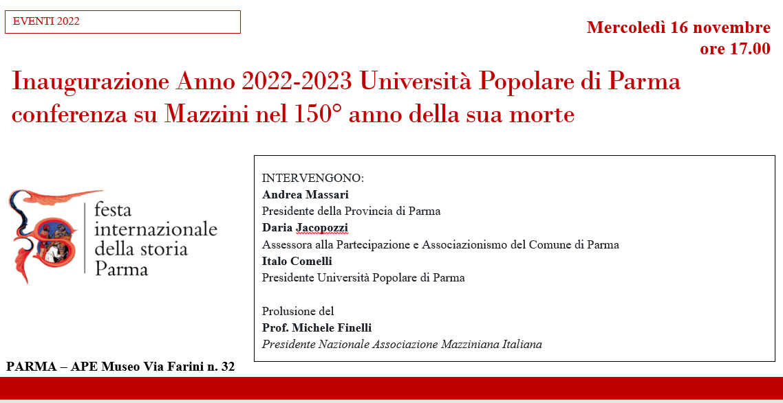 LOCANDINA Inaugurazione Anno 2022-2023 Università Popolare di Parma Inaugurazione dell’Anno Accademico 2022-2023 dell’Università Popolare di Parma Conferenza su Giuseppe Mazzini nel 150oanno della sua morte INTERVENGONO:Andrea MassariPresidente della Provincia di ParmaDaria JacopozziAssessora alla Partecipazione e Associazionismo del Comune di ParmaItalo