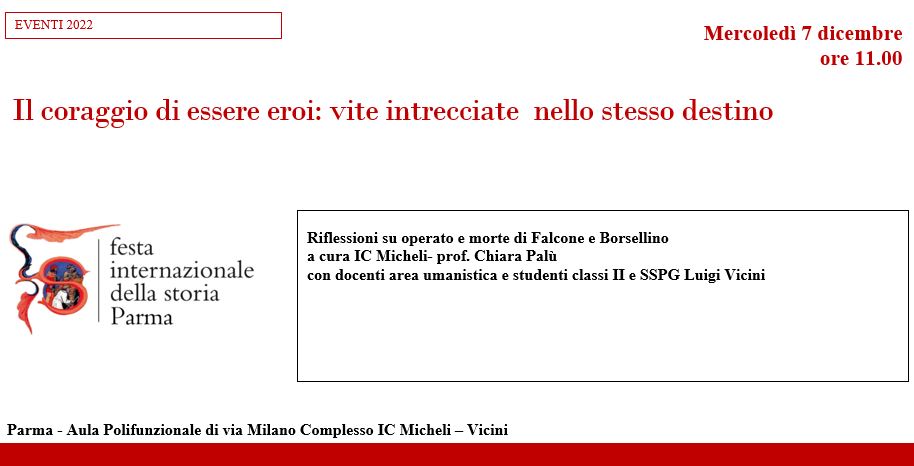 LOCANDINA Il coraggio di essere eroi: vite intrecciate nellostesso destino Riflessioni su operato e morte di Falcone e Borsellino a cura IC Micheli- prof. Chiara Palù con docenti area umanistica e studenti classi II e SSPG Luigi Vicini Mercoledì 7