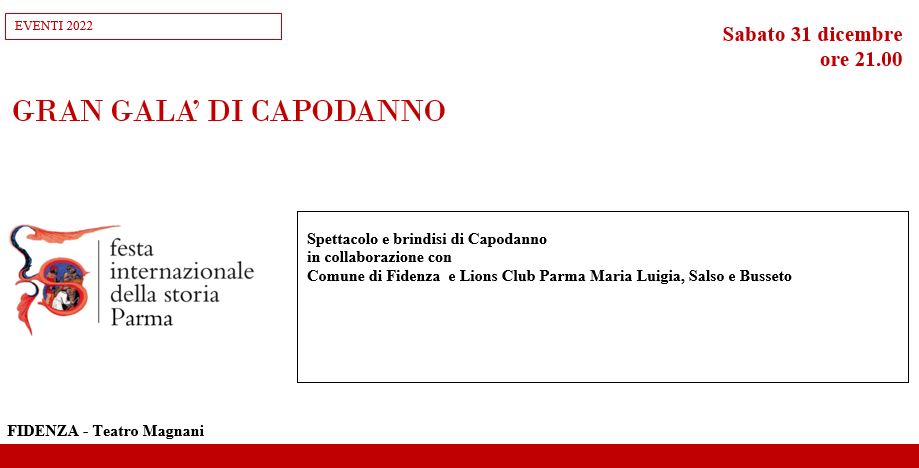LOCANDINA GRAN GALA’ DI CAPODANNO Spettacolo e brindisi diCapodanno in coll. con Comune di Fidenza e Lions Club Parma Maria Luigia, Salso e Busseto Sabato 31 dicembre h. 21.00 FIDENZA – Teatro Magnani