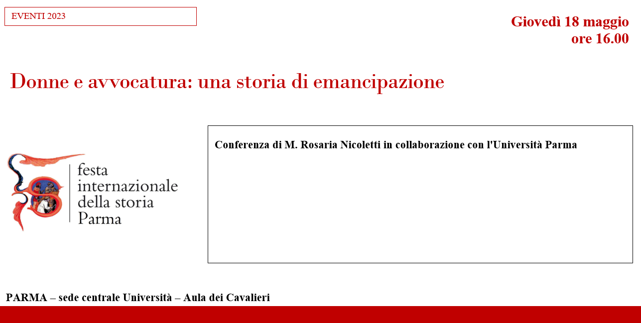 Donne e avvocatura: una storia di emancipazione Conferenza di M: Rosaria Nicoletti in coll. con Università Parma Giovedì 18 maggio h. 16 PARMA – sede centrale Università – Aula dei Cavalieri