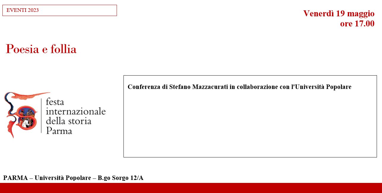 LOCANDINA Poesia e follia Conferenza di Stefano Mazzacurati in coll. con Università Popolare Venerdì 19 maggio h. 17 PARMA – Università Popolare – B.go Sorgo 12/A