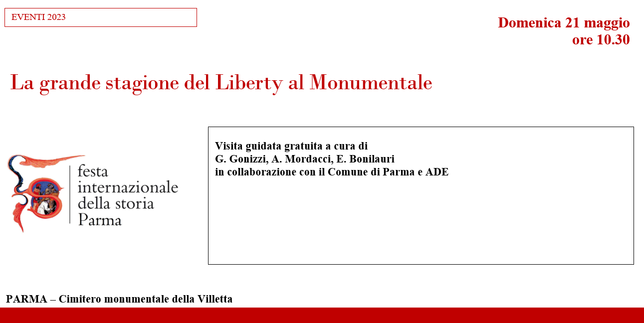 La grande stagione del Liberty al Monumentale Visita guidata gratuita a cura di G. Gonizzi, A. Mordacci, E. Bonilauri in coll. con Comune di Parma e ADE Domenica 21 maggio h. 10,30 PARMA – Cimitero monumentale della Villetta (ritrovo 10