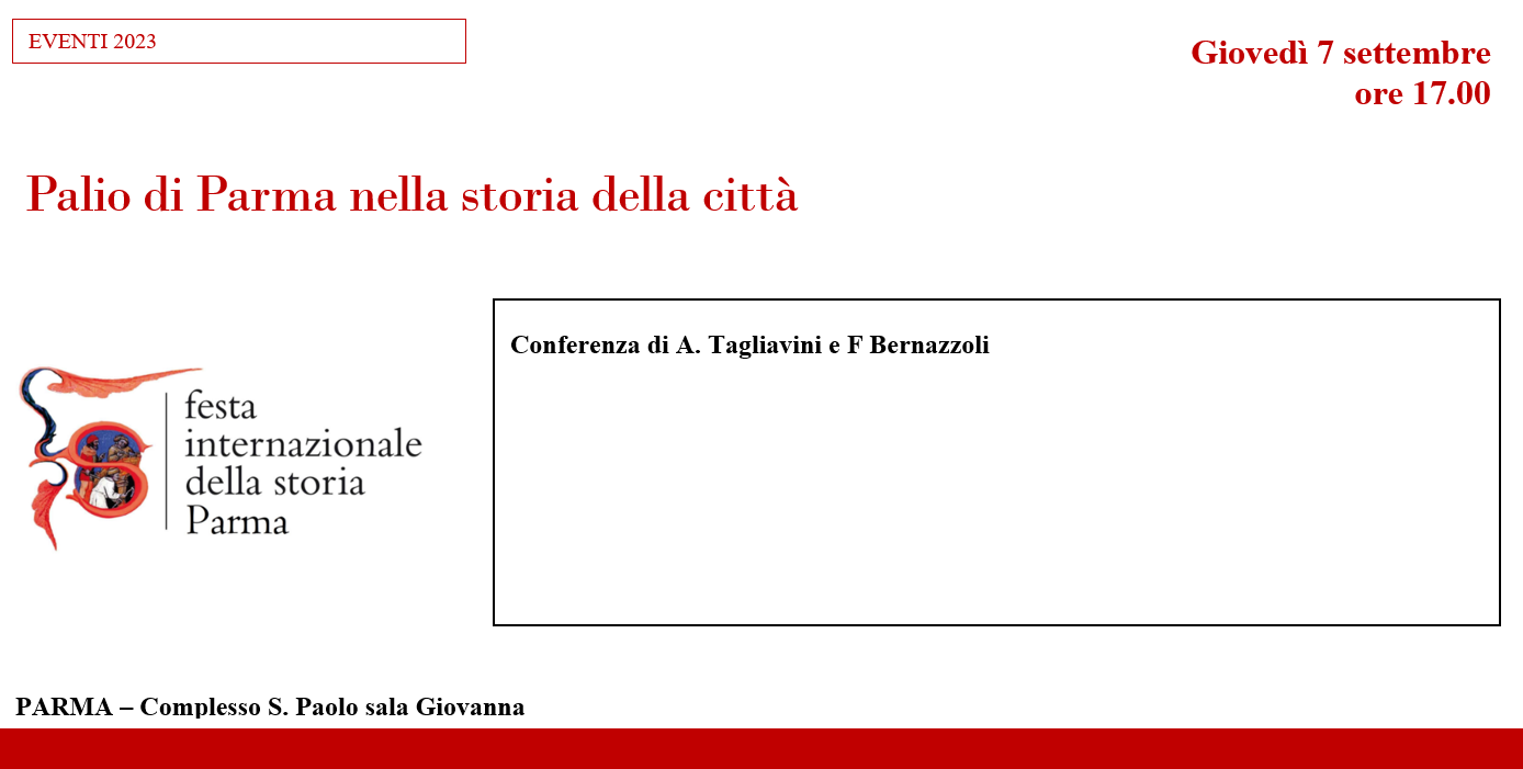 Giovedì 7 settembre h. 17 Palio di Parma nella storia della città Conferenza di A. Tagliavini e F Bernazzoli PARMA – Complesso S. Paolo sala Giovanna