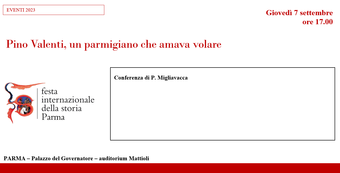 Pino Valenti, un parmigiano che amava volare Conferenza di P. Migliavacca Giovedì 7 settembre h. 17 PARMA – Palazzo del Governatore – auditorium Mattioli