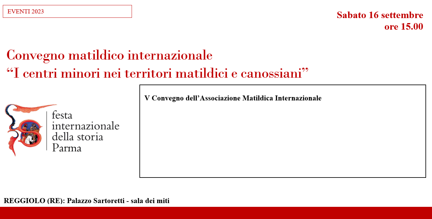 sabato 16 SETTEMBRE ore 9.00-11.30 I ‘Centri minori’ nei territori matildici e canossaniV Convegno dell’Associazione Matildica InternazionalePalazzo Sartoretti, Sala dei miti.II sessione – Presiede Raffaele Savigni Mattia F. A. Cantatore (Università di Verona), Il distretto plebano di Santa Maria di