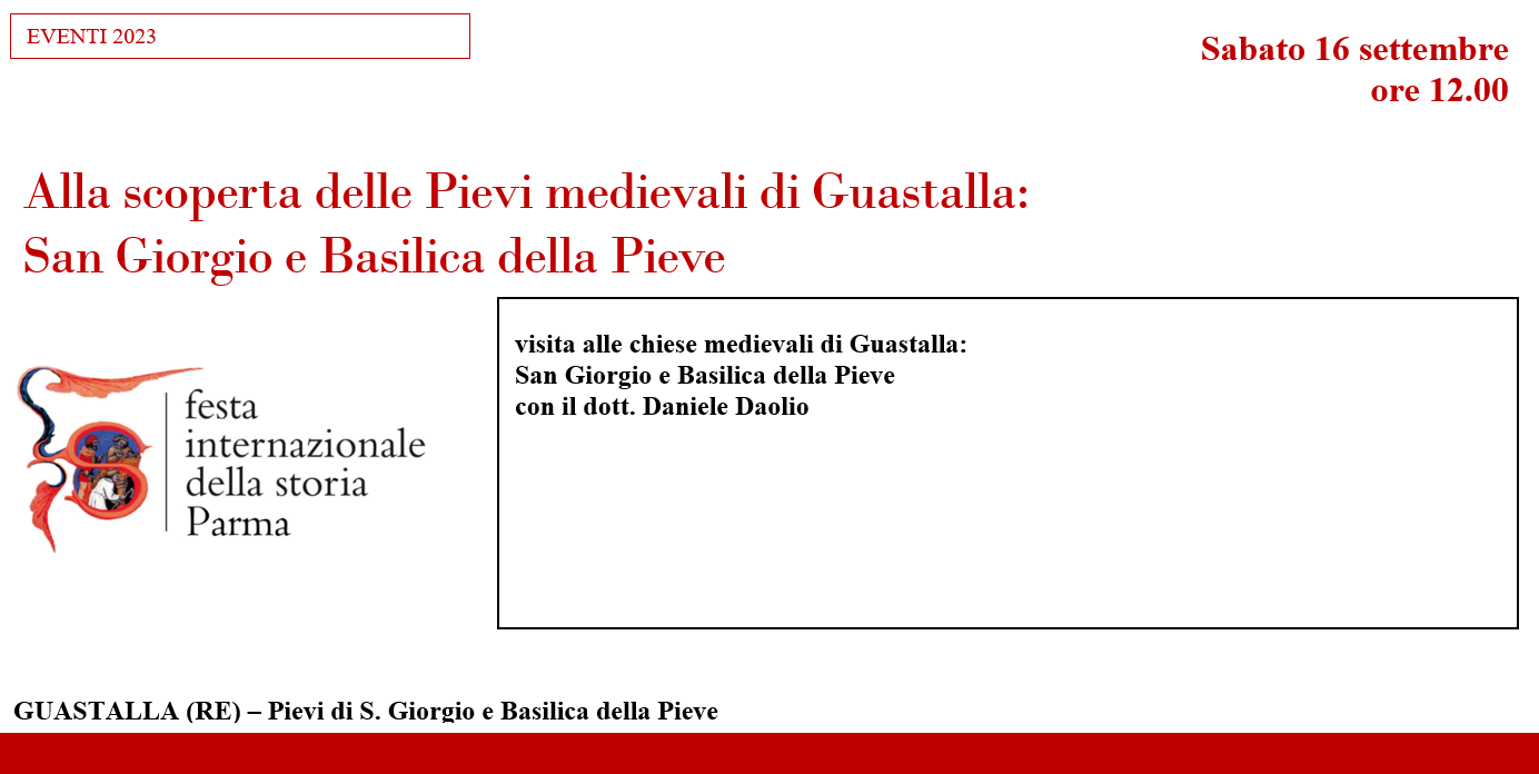 sabato 16 SETTEMBRE ore 12.00-15.00 Trasferimento e visita alle chiese medievali di Guastalla:San Giorgio e Basilica della Pievecon il dott. Daniele Daolio Guastalla, La PieveEdificata probabilmente tra il IX e il X secolo in stile romanicolombardo.Posta all’interno dei domini di