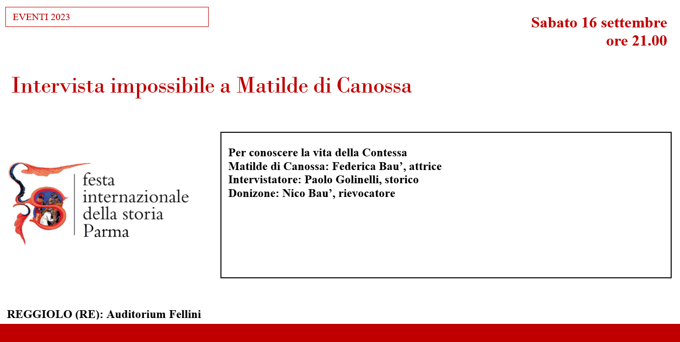 sabato 16 SETTEMBRE ore 21.00-22.30 INTERVISTA IMPOSSIBILE AMATILDE DI CANOSSAPer conoscere la vita della ContessaAuditorium Fellini Matilde di Canossa: Federica Bau’, attriceIntervistatore: Paolo Golinelli, storicoDonizone: Nico Bau’, rievocatore Coro: Cappella Musicale “Adolfo Tanzi”, diretta dal m.° Davide Nigrelli.Ambientazione medievale degli