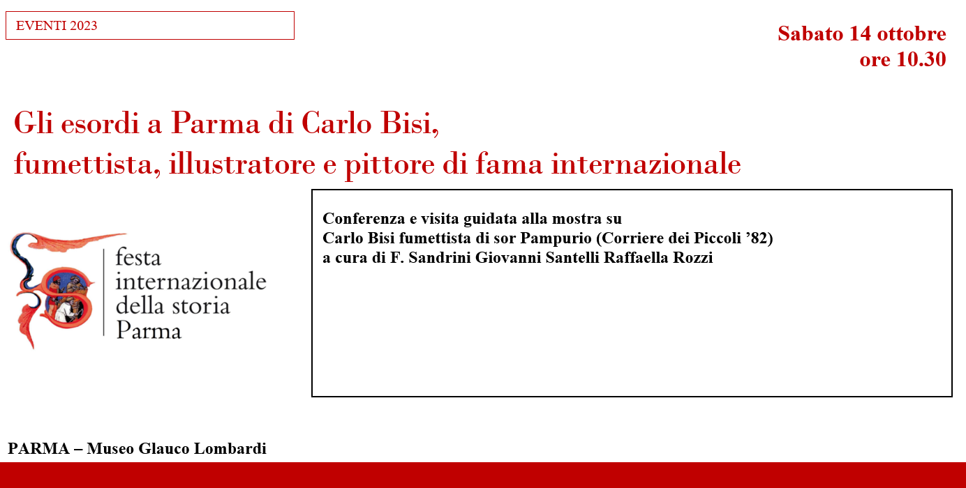 Sabato 14 ottobre h. 10,30 Gli esordi a Parma di Carlo Bisi, fumettista, illustratore e pittore di fama internazionale Conferenza e visita guidata alla mostra su Carlo Bisi fumettista di sor Pampurio (Corriere dei Piccoli ’82) a cura di F.