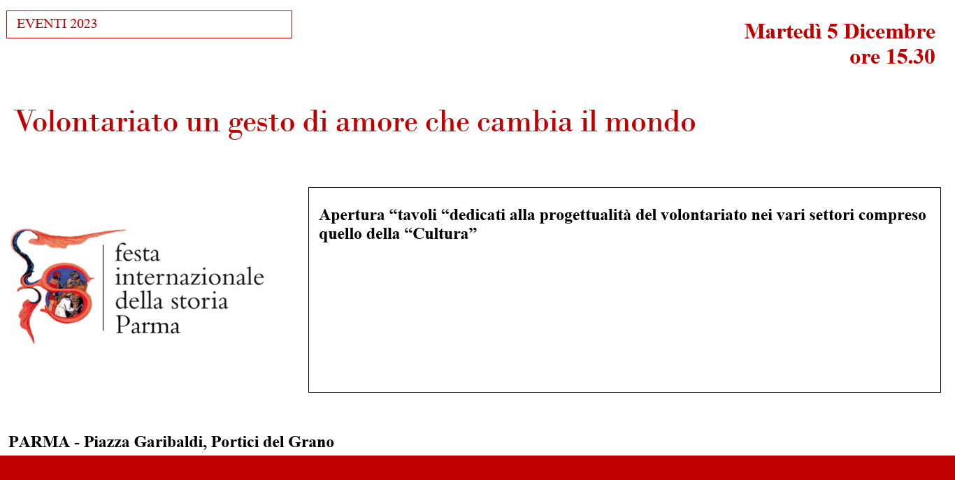 P.zza Garibaldi  sotto i portici del grano Apertura “tavoli “dedicati alla progettualità del volontariato nei vari settori compreso quello della “Cultura”