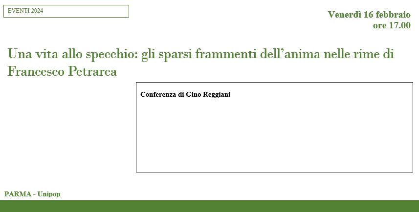 LOCANDINA Una vita allo specchio: gli sparsi frammenti dell’anima nelle rime di Francesco Petrarca Conferenza di Gino Reggiani Venerdì 16 febbraio h. 17 PARMA – Unipop