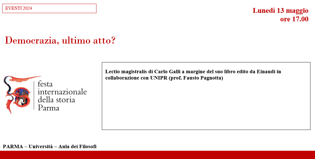 Democrazia, ultimo atto? Lectio magistralis di Carlo Galli a margine del suo libro edito da Einaudi in collaborazione con UNIPR (prof. Fausto Pagnotta) Lunedì 13 maggio h. 17 PARMA – Università – Aula dei Filosofi