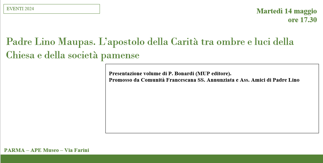 Padre Lino Maupas. L’apostolo della Carità tra ombre e luci della Chiesa e della società parmense Presentazione volume di P. Bonardi (MUP editore). Promosso da Comunità Francescana SS. Annunziata e Ass. Amici di Padre Lino Martedì 14 maggio h. 17,30
