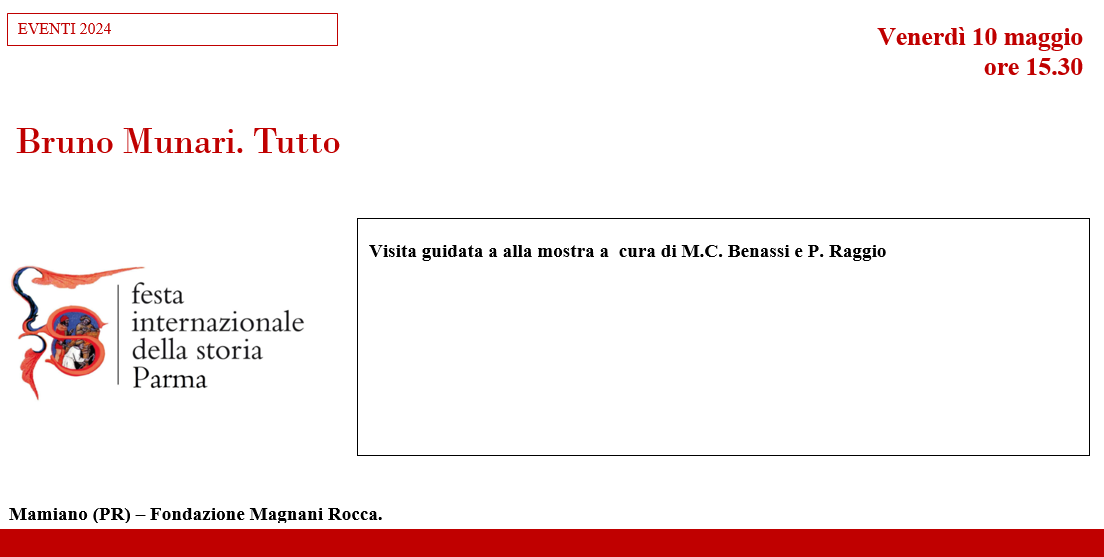 Bruno Munari. Tutto Visita guidata a alla mostra a cura di M.C. Benassi e P. Raggio Venerdì 10 maggio h. 15,30 Mamiano (PR) – Fondazione Magnani Rocca. Ingresso € 12 + € 5 solo per esterni all’Associazione o soci non