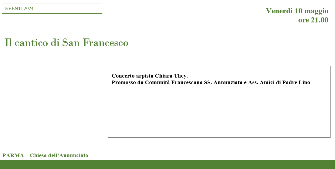Il cantico di San Francesco Concerto arpista Chiara They. Promosso da Comunità Francescana SS. Annunziata e Ass. Amici di Padre Lino Venerdì 10 maggio h. 21 PARMA – Chiesa dell’Annunciata Ingresso a offerta pro Centro accoglienza familiari bimbi ricoverati in