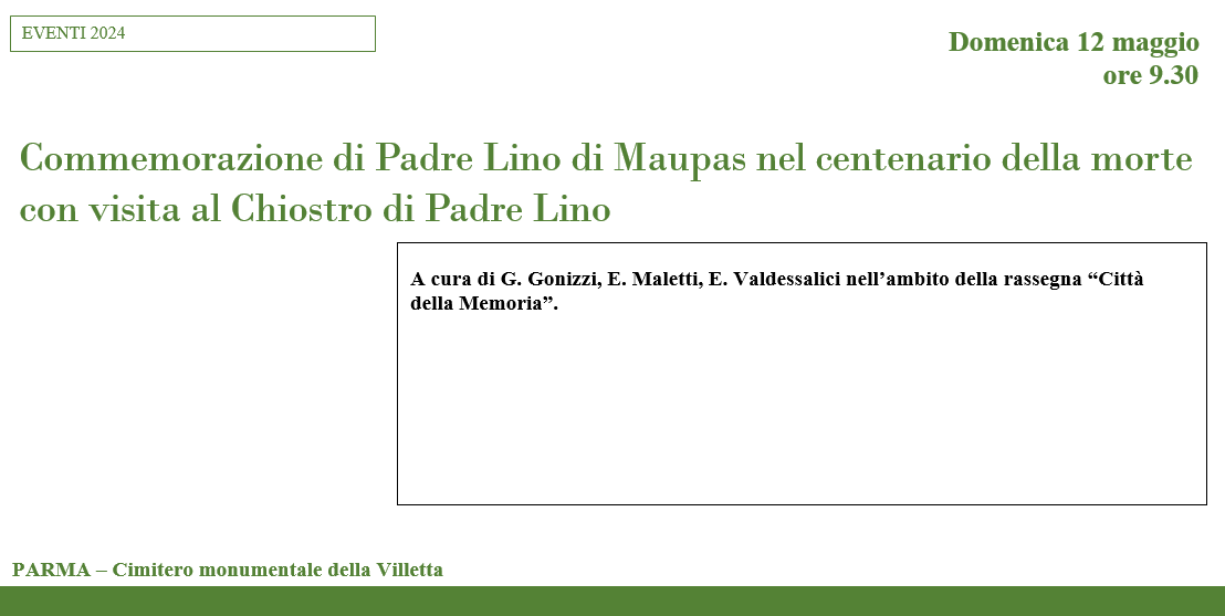 Commemorazione di Padre Lino di Maupas nel centenario della morte con visita al Chiostro di Padre Lino A cura di G. Gonizzi, E. Maletti, E. Valdessalici nell’ambito della rassegna “Città della Memoria”. Domenica 12 maggio h. 9,30 PARMA – Cimitero