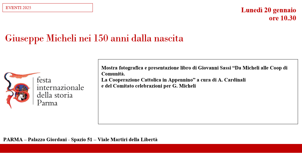 Incontro conclusivo del Comitato celebrativo per Giuseppe Micheli A cura della assessora Daria Jacopozzi e del Comitato celebrazioni per G. Micheli con presentazione filmati e rendicontazione progetto Giovedì 30 gennaio h. 15 PARMA – Palazzo Giordani – Spazio 51 –