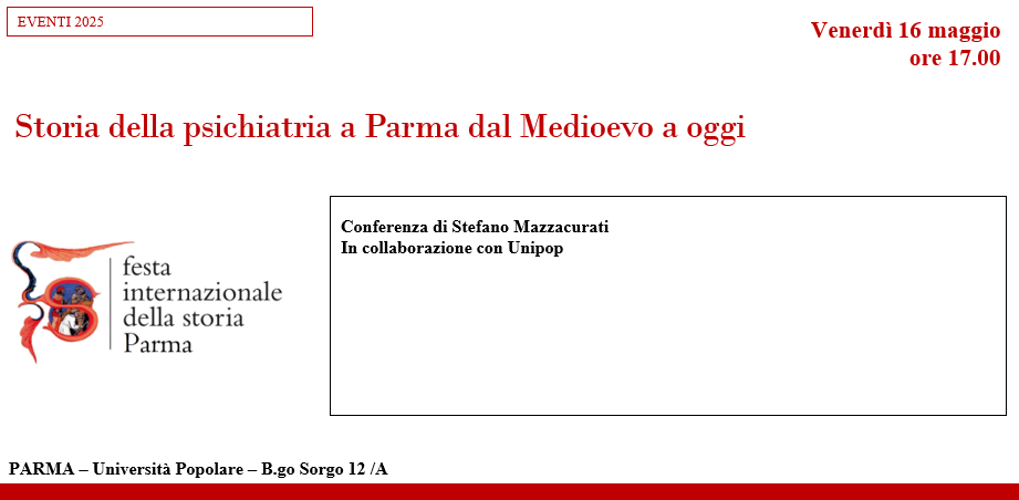 Storia della psichiatria a Parma dal Medioevo a oggi Conferenza di Stefano MazzacuratiIn coll. con Unipop 16 maggio ore 17.00 PARMA – Università Popolare – B.go Sorgo 12 /A