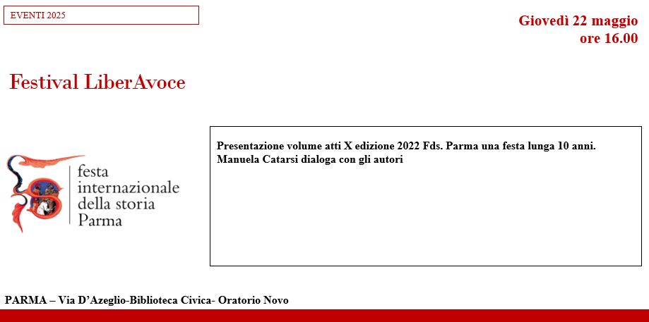 Presentazione volume atti X edizione 2022 Fds. Parma una festa lunga 10 anni.Manuela Catarsi dialoga con gli autori
