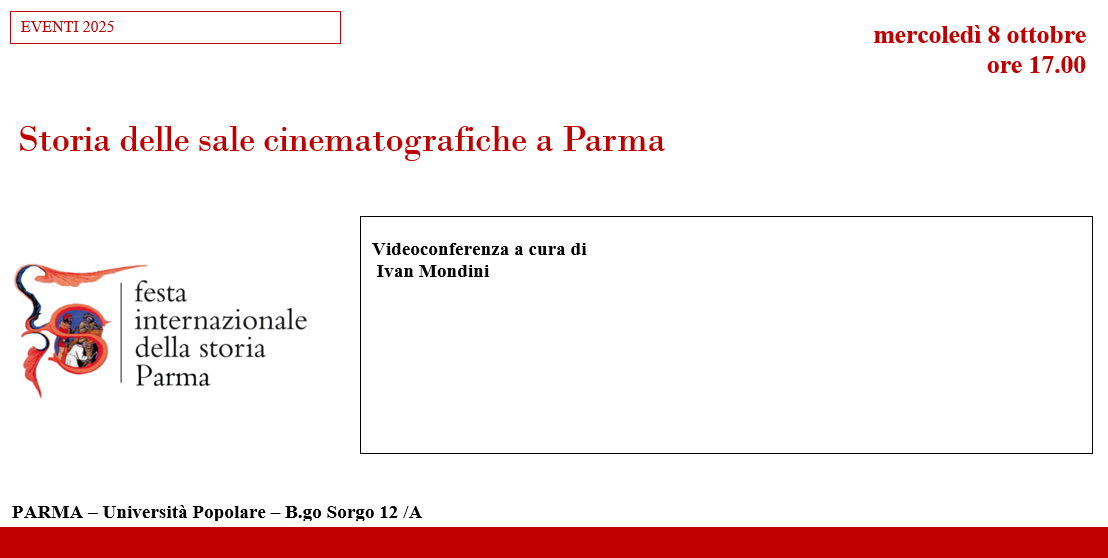 Continua a leggereStoria delle sale cinematografiche a Parma Videoconferenza a cura di Ivan Mondini mercoledì 8 ottobre ore 17 PARMA UNIPOP B.go Sorgo 12/a