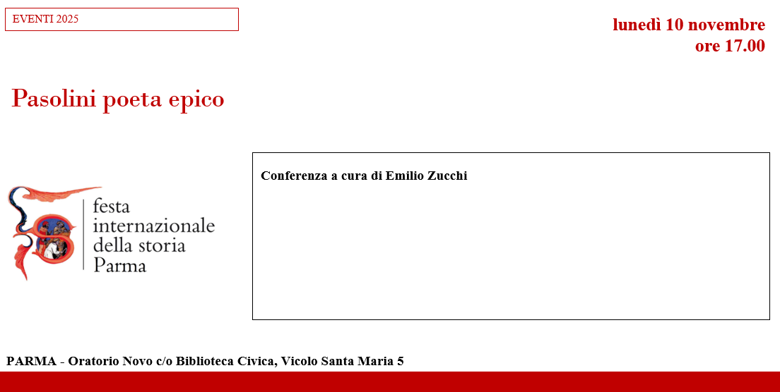 LOCANDINA Pasolini poeta epico Conferenza a cura di Emilio Zucchi lunedì 10 novembreore 17.00 PARMAOratorio Novo c/oBiblioteca CivicaVicolo Santa Maria5