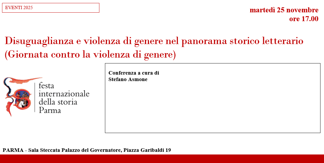 Disuguaglianza e violenza di genere nel panorama storico letterario (Giornata contro la violenza di genere) Conferenza a cura diStefano Asmone martedì 25 novembreore 17 PARMASala SteccataPalazzo del GovernatorePiazza Garibaldi 19