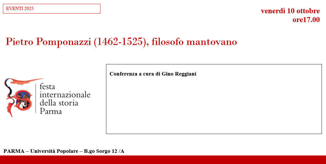 LOCANDINA Pietro Pomponazzi (1462-1525), filosofo mantovano Conferenza a cura di Gino Reggiani venerdì 10 ottobre ore 17 PARMA UNIPOP B.go Sorgo 12/4