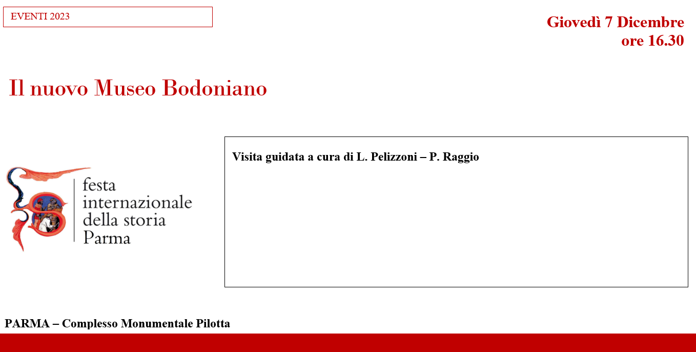 LOCANDINA Visita guidata all’ala nuova del Complesso Pilotta A cura di P. Raggio Domenica 3 Dicembre h. 10.30 PARMA – Complesso Monumentale Pilotta (Visita guidata gratuita per i soci in regola con iscrizione, € 5 tutti gli altri)