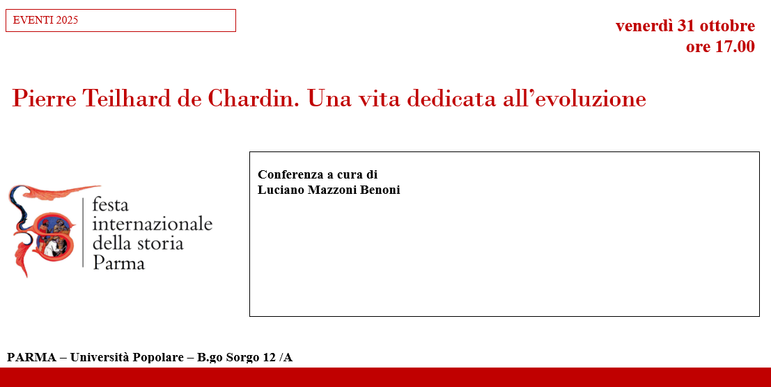 LOCANDINA Pierre Teilhard de Chardin. Una vita dedicata all’evoluzione Conferenza a cura di Luciano Mazzoni Benoni venerdì 31 ottobre ore 17 PARMA – UNIPOP B.go Sorgo 12/a