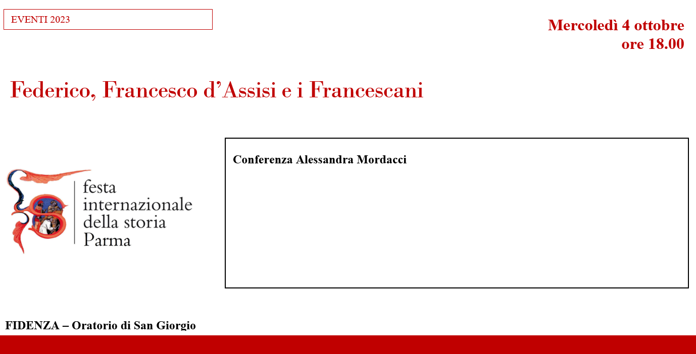 SCARICA IL PROGRAMMA DELLA FESTA DELLA STORIA – FIDENZA 2023 Mercoledì 4 ottobre h. 18 Federico, Francesco d’Assisi e i Francescani Conferenza Alessandra Mordacci FIDENZA – Oratorio di San Giorgio