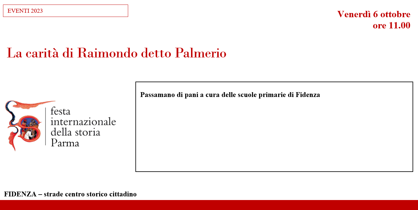SCARICA IL PROGRAMMA DELLA FESTA DELLA STORIA – FIDENZA 2023 Venerdì 6 ottobre h. 11 La carità di Raimondo detto Palmerio Passamano di pani a cura delle scuole primarie di Fidenza FIDENZA – strade centro storico cittadino