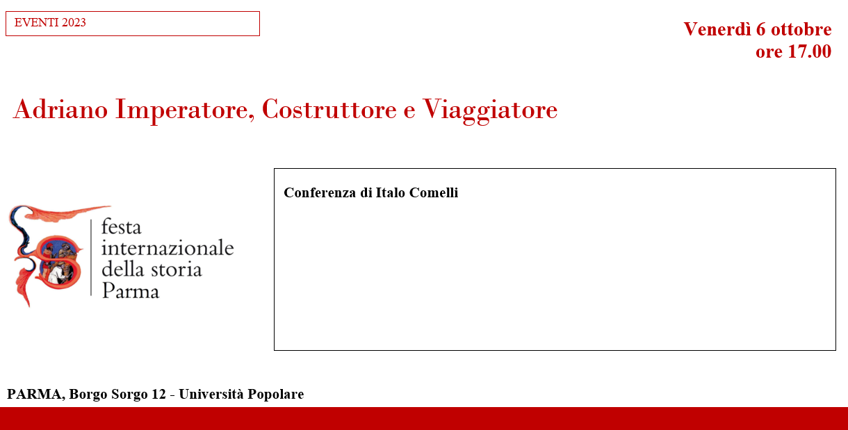 LOCANDINA Venerdì 6 ottobre h 17.00 Adriano Imperatore, Costruttore e Viaggiatore Conferenza di Italo Comelli PARMA -Università Popolare Borgo Sorgo 12/a, Parma