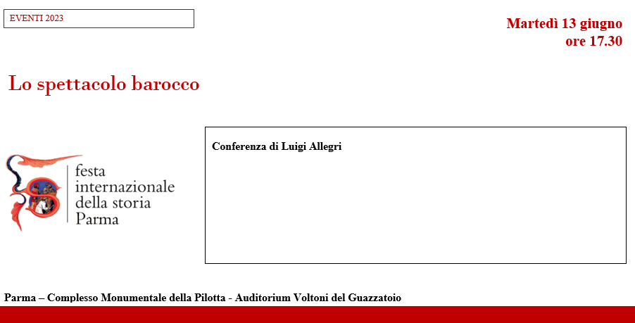 Lo spettacolo barocco Conferenza di Luigi Allegri Martedì 13 giugno ore 17,30 Parma – Complesso Monumentale della Pilotta – Auditorium Voltoni del Guazzatoio Ingresso gratuito. Posti limitati