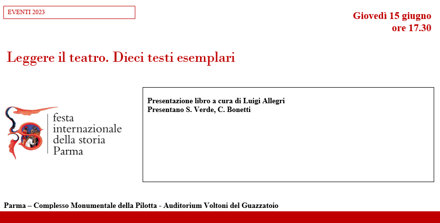 Leggere il teatro. Dieci testi esemplari Presentazione libro a cura di Luigi Allegri Presentano S. Verde, C. Bonetti Giovedì 15 giugno ore 17.30 Parma – Complesso Monumentale della Pilotta – sala conferenze Voltoni del Guazzatoio Ingresso gratuito. Posti limitati