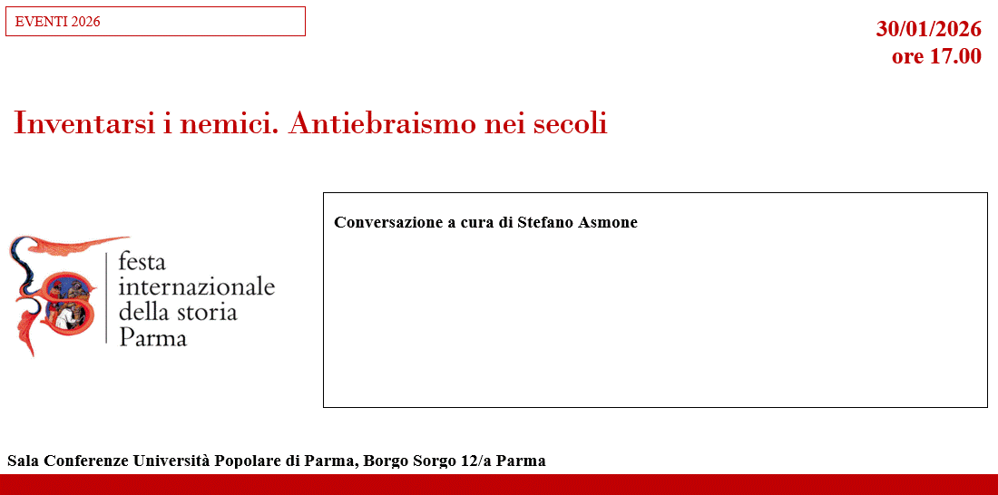 LOCANDINA Inventarsi i nemici – Antiebraismo nei secoli Conversazione a cura di Stefano Asmone 30 Gennaio 2026, ore 17.00Sala conferenze Università Popolare di ParmaBorgo Sorgo 12/a Parma