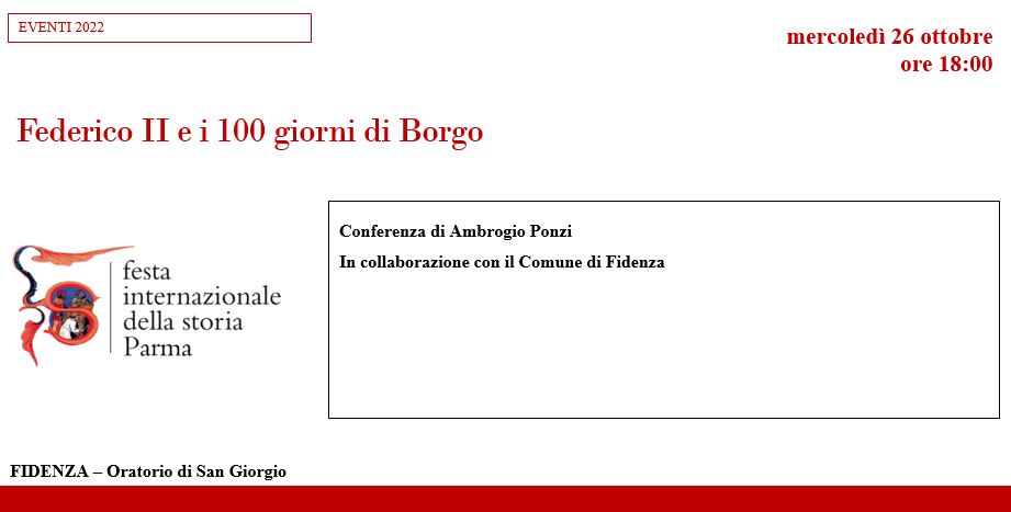 LOCANDINA Federico II e i 100 giorni di Borgo Conferenza di Ambrogio Ponzi In collaborazione con il Comune di Fidenza mercoledì 26 ottobre ore 18:00 FIDENZA – Oratorio di San Giorgio