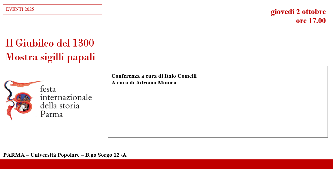 LOCANDINA Il Giubileo del 1300, Mostra sigilli papali Conferenza a cura di Italo Comelli A cura di Adriano Monica giovedì 2 ottobre ore 17 PARMA UNIPOP B.go Sorgo 12/a