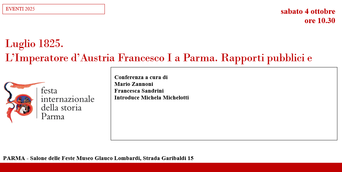 LOCANDINA Luglio 1825. L’Imperatore d’Austria Francesco I a Parma. Rapporti pubblici e privati tra padre e figlia Conferenza a cura di Mario Zannoni Francesca Sandrini Introduce Michela Michelotti sabato 4 ottobre ore 10,30 PARMA Salone delle Feste Museo Glauco Lombardi