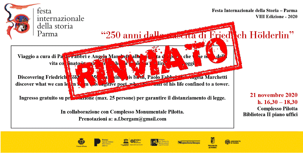 21 novembre 2020 h. 16,30 – 18,30 Complesso Pilotta Biblioteca II piano uffici. Viaggio a cura di Paolo Fabbri e Angela Marchetti alla scoperta del poeta che visse metà della vita confinato in una torre e che ha qualcosa da